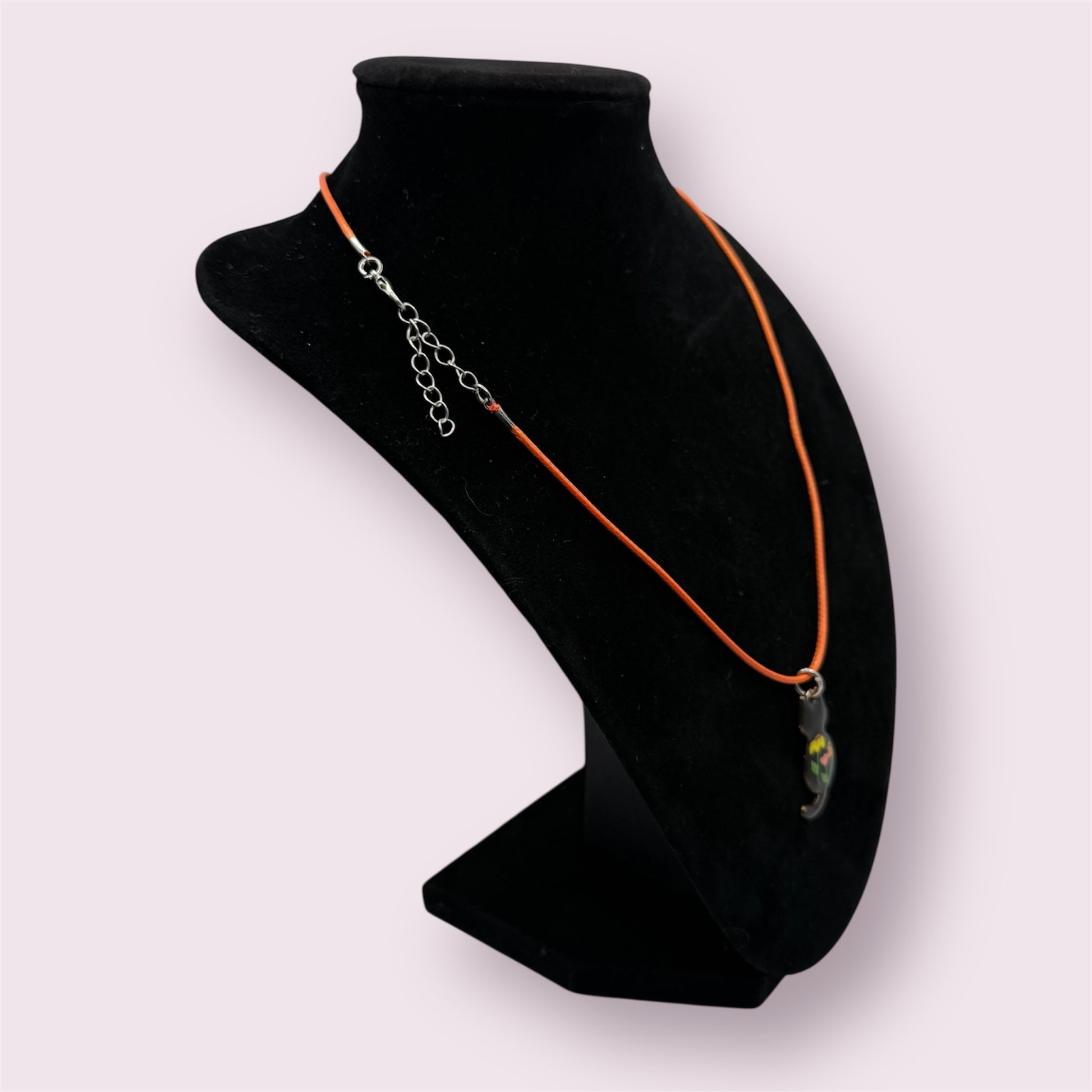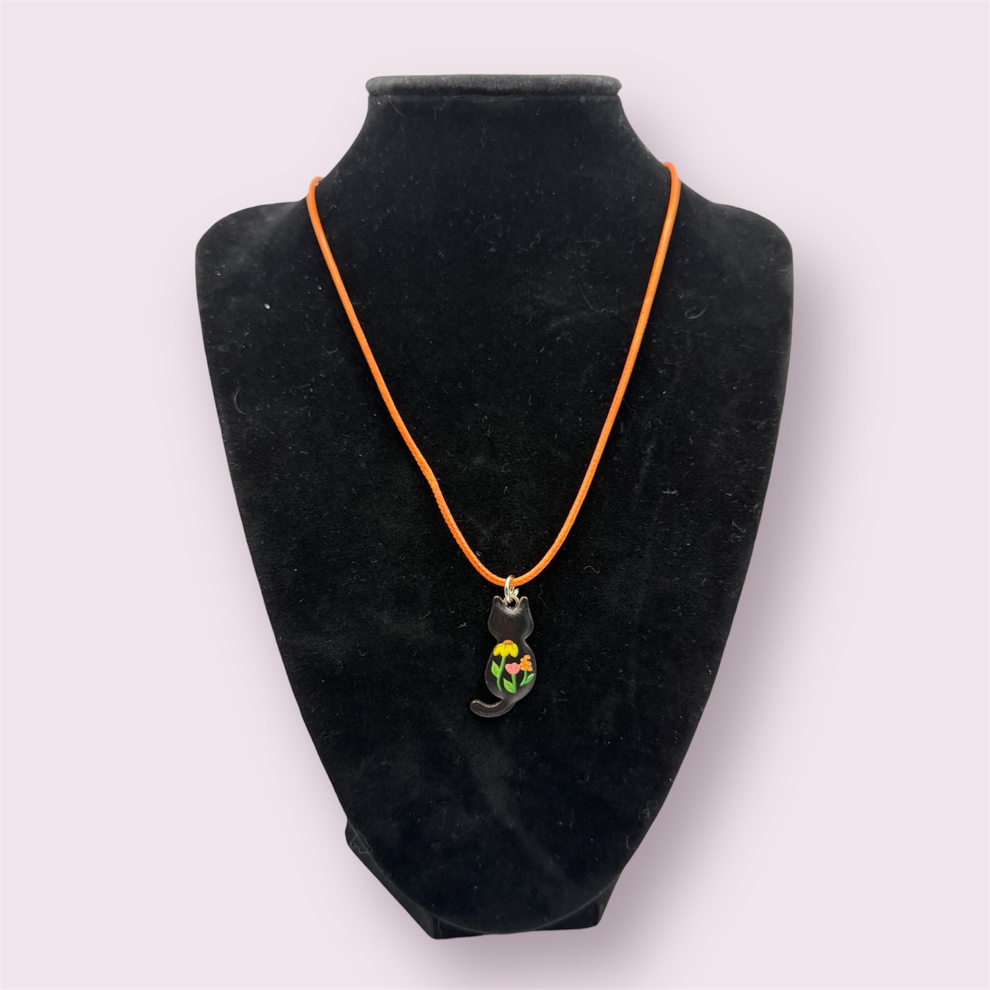 A black cat silhouette with colorful floral designs on an 18 inch soft cord with extender.