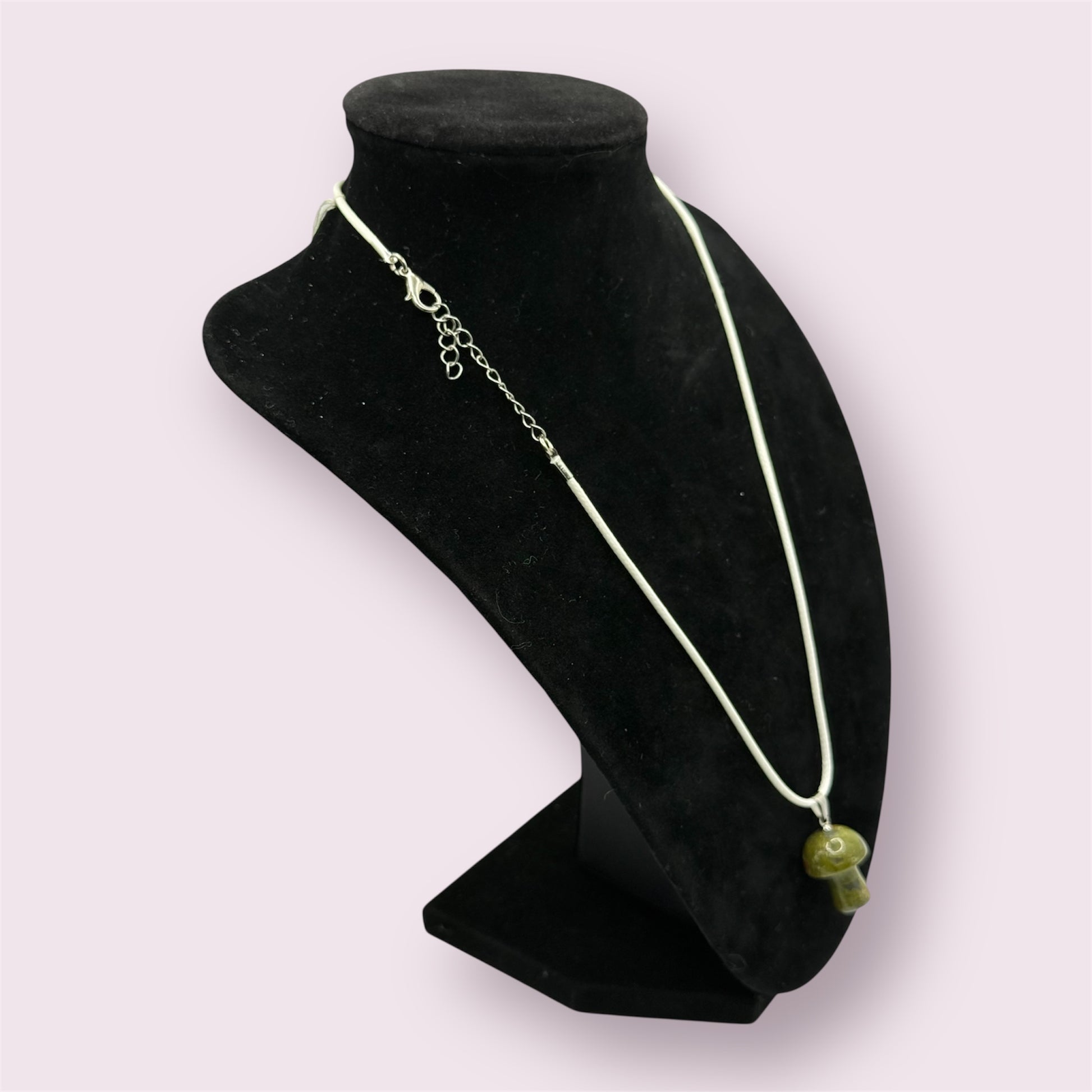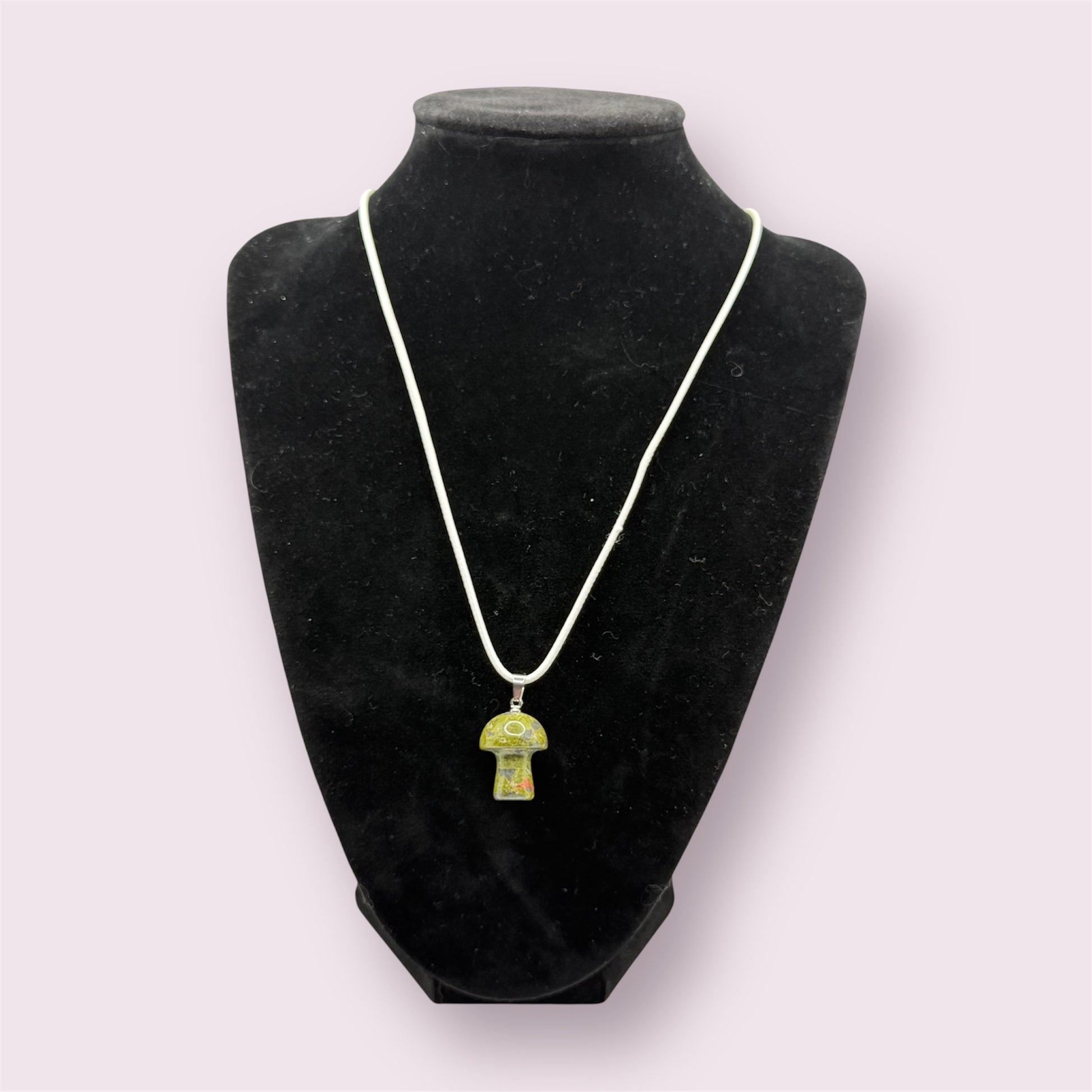 A blood jasper mushroom stone pendant on an 18 inch soft white cord with extender.
